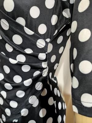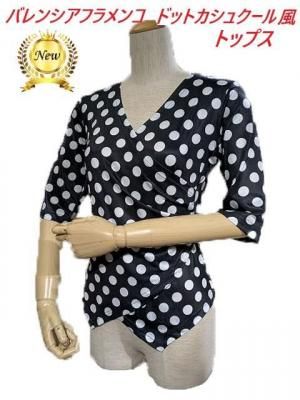 シンプルなVネック(カシュクール風)ホワイトドット付トップス 伸縮ポリエステル素材にて動きやすいフラメンコトップスです カシュクールのような胸元が重なっていますが 左脇部分は縫われていています パッと見 スッキリ見えるVネックのようですが カシュクールのようにも見えるオシャレデザイン フロント裾部分の前下がりデザインもステキ(後ろなし) メーカーサイズ Lサイズ表記ですが M~Lの方用に適しています 平置きにて脇下左右B約82cm程〜 W約70ほど〜  着丈約50〜60cm 伸縮性有 XLサイズ表記 L〜XLの方に適しています 平置きにて脇下左右B86cm程〜 W約76ほど〜 着丈約51〜62cm 伸縮性有 返品交換不可
